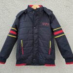 Winter-ready boys’ puffer jacket in solid dark navy blue with bold red and yellow accents. Features a detachable hood, zip and snap button closure, ribbed cuffs and hem, and two pockets for functionality and warmth.