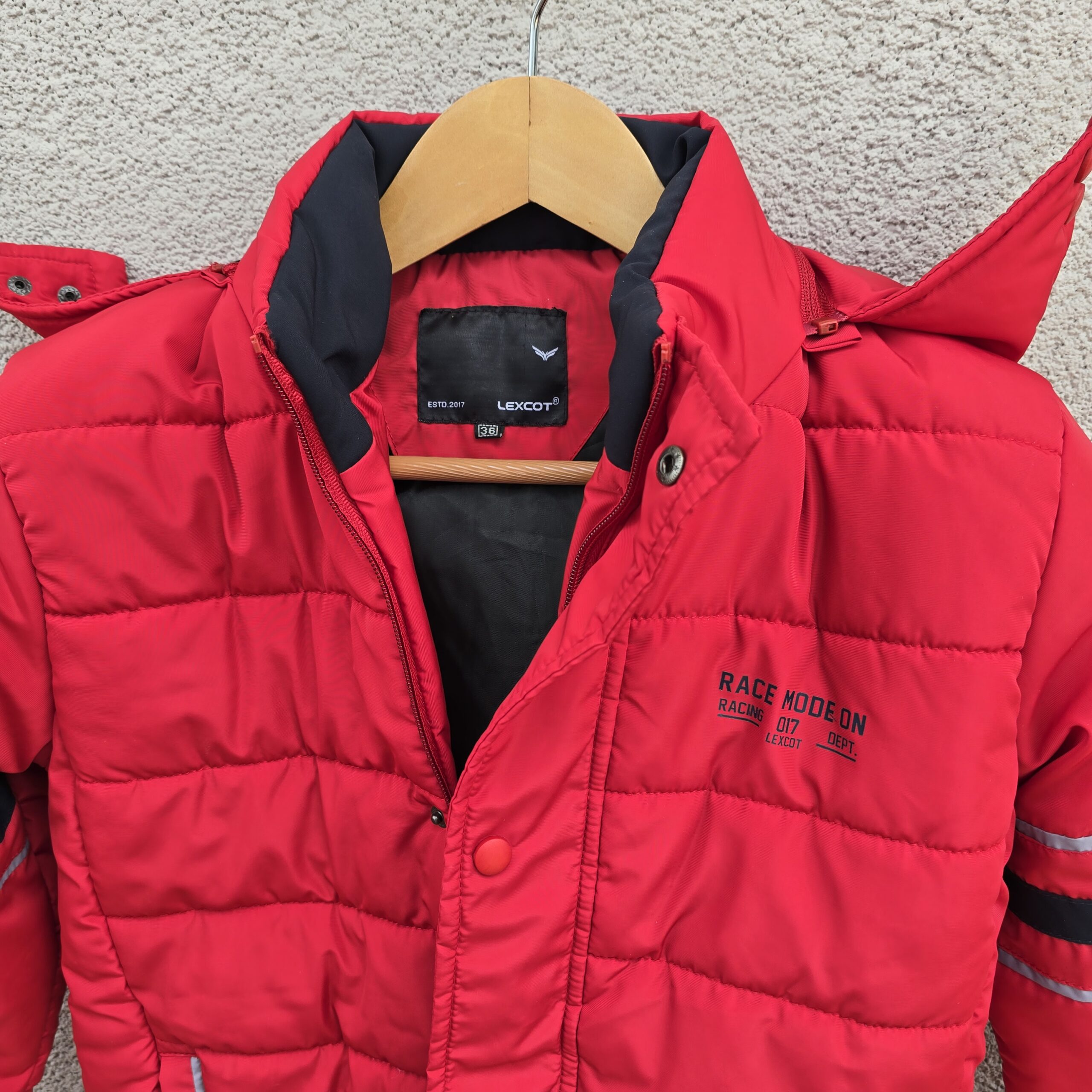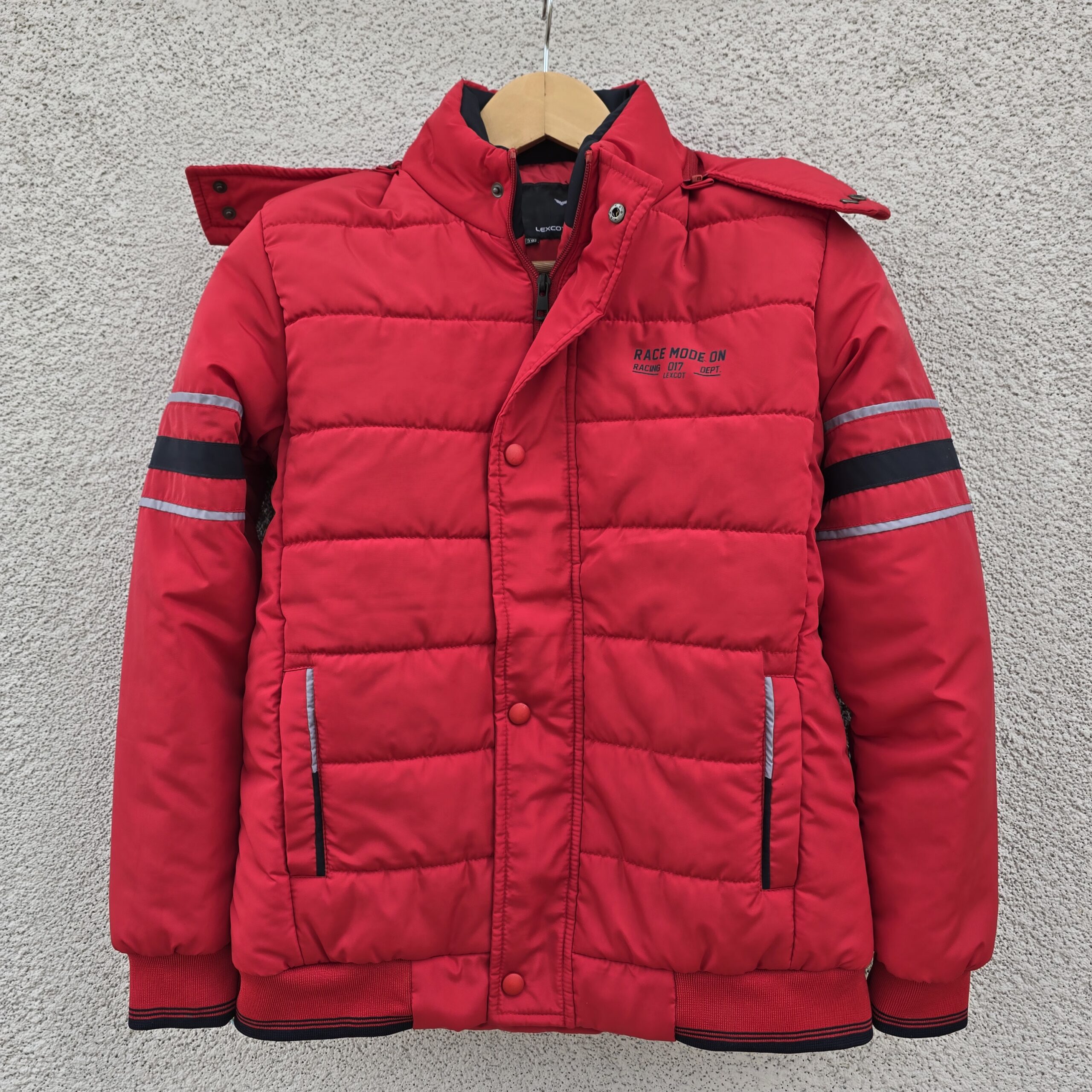 red colour puffer jacket for boys with added style from two contrasting colors. Features a detachable hood with button closure, zip and snap button front, ribbed cuffs and hem, and a simple branding print—ideal for winter comfort and style.