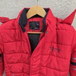 Keep your little one warm and stylish with this red colour puffer jacket for boys, accented with two additional colors for a fun and modern look. Built for winter comfort, this jacket comes with a detachable hood secured by buttons, dual zip and snap button front closure, and ribbed sleeves and waist for wind protection. A simple printed brand logo adds a subtle touch. Perfect for everyday wear, school, or outdoor play in chilly weather.