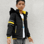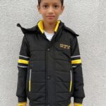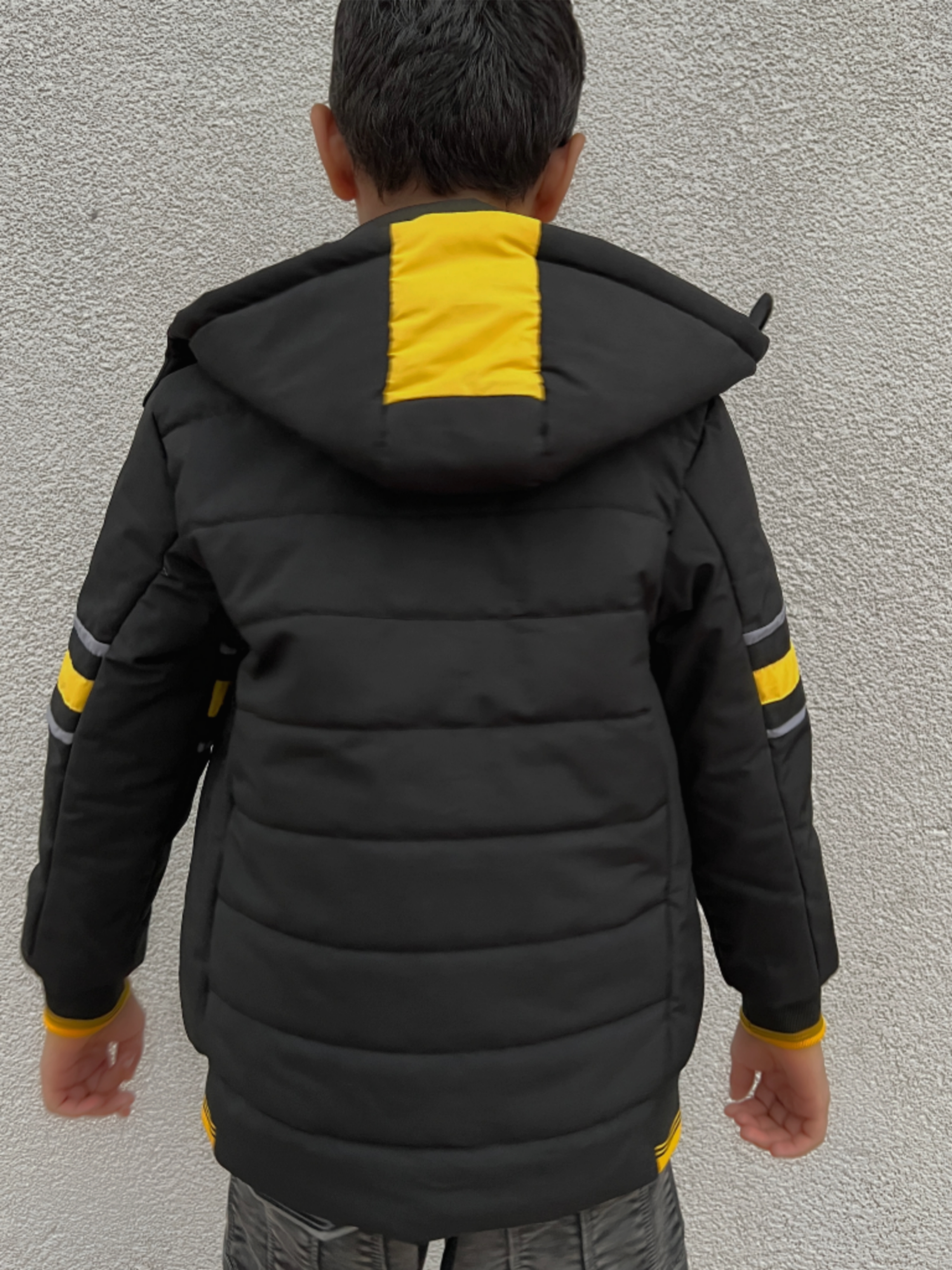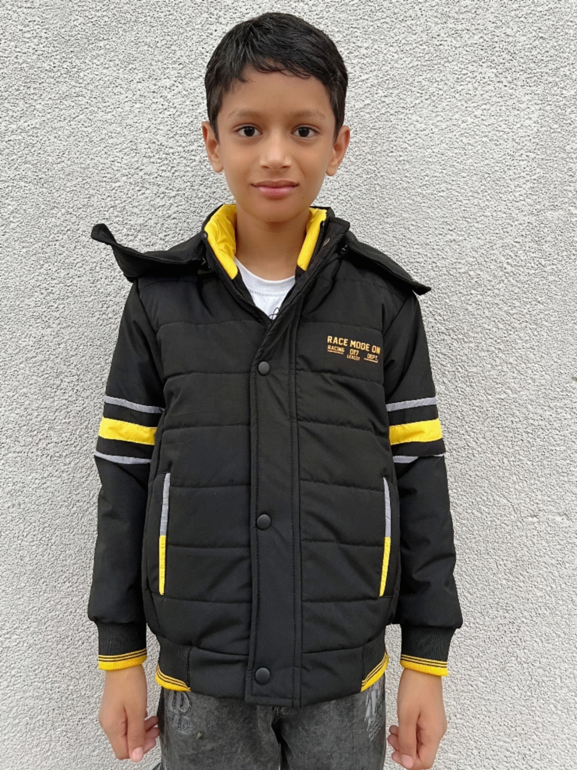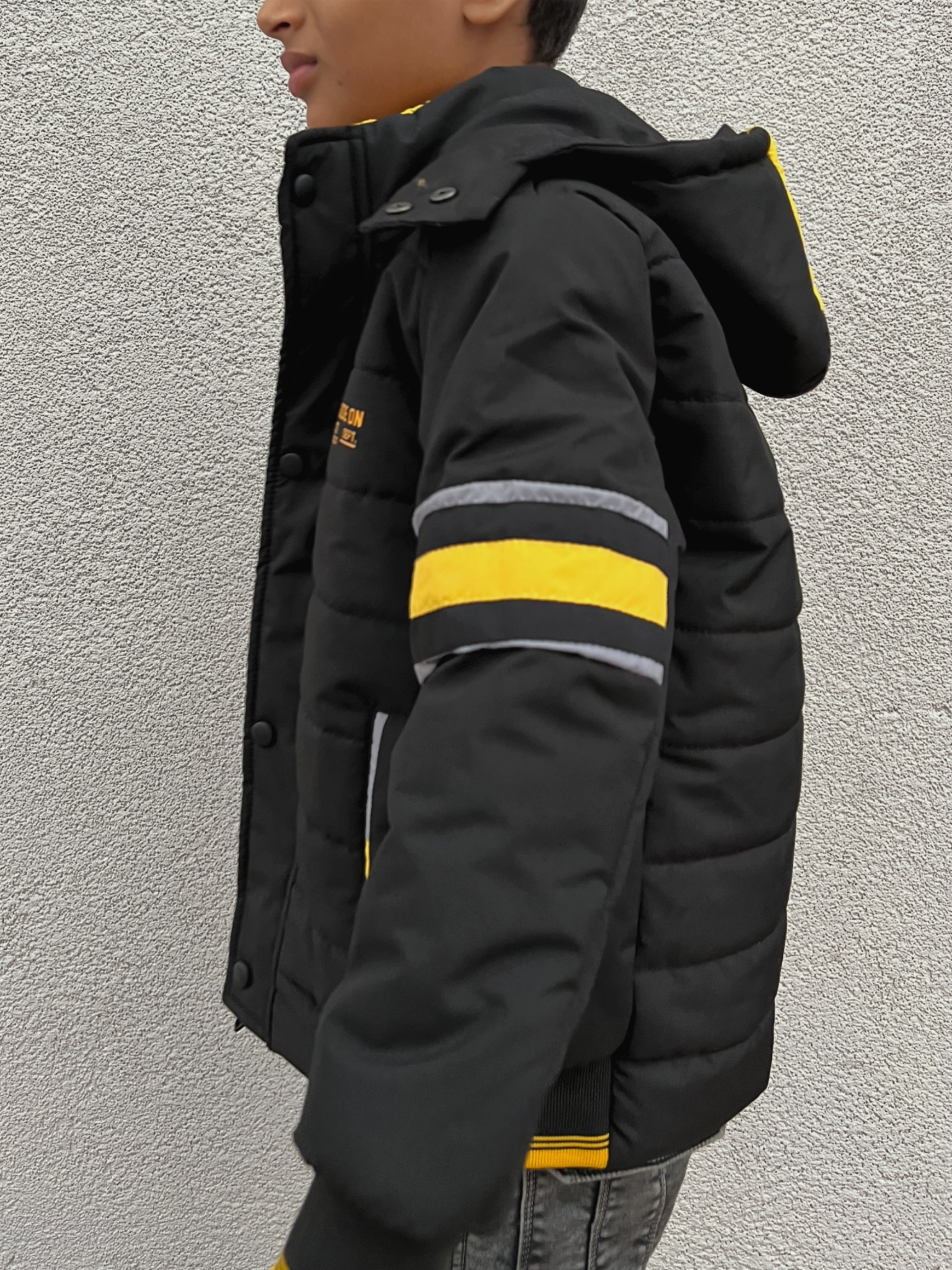 Winter-ready boys’ puffer jacket in solid black colour with bold yellow and grey accents. Features a detachable hood, zip and snap button closure, ribbed cuffs and hem, and two pockets for functionality and warmth.
