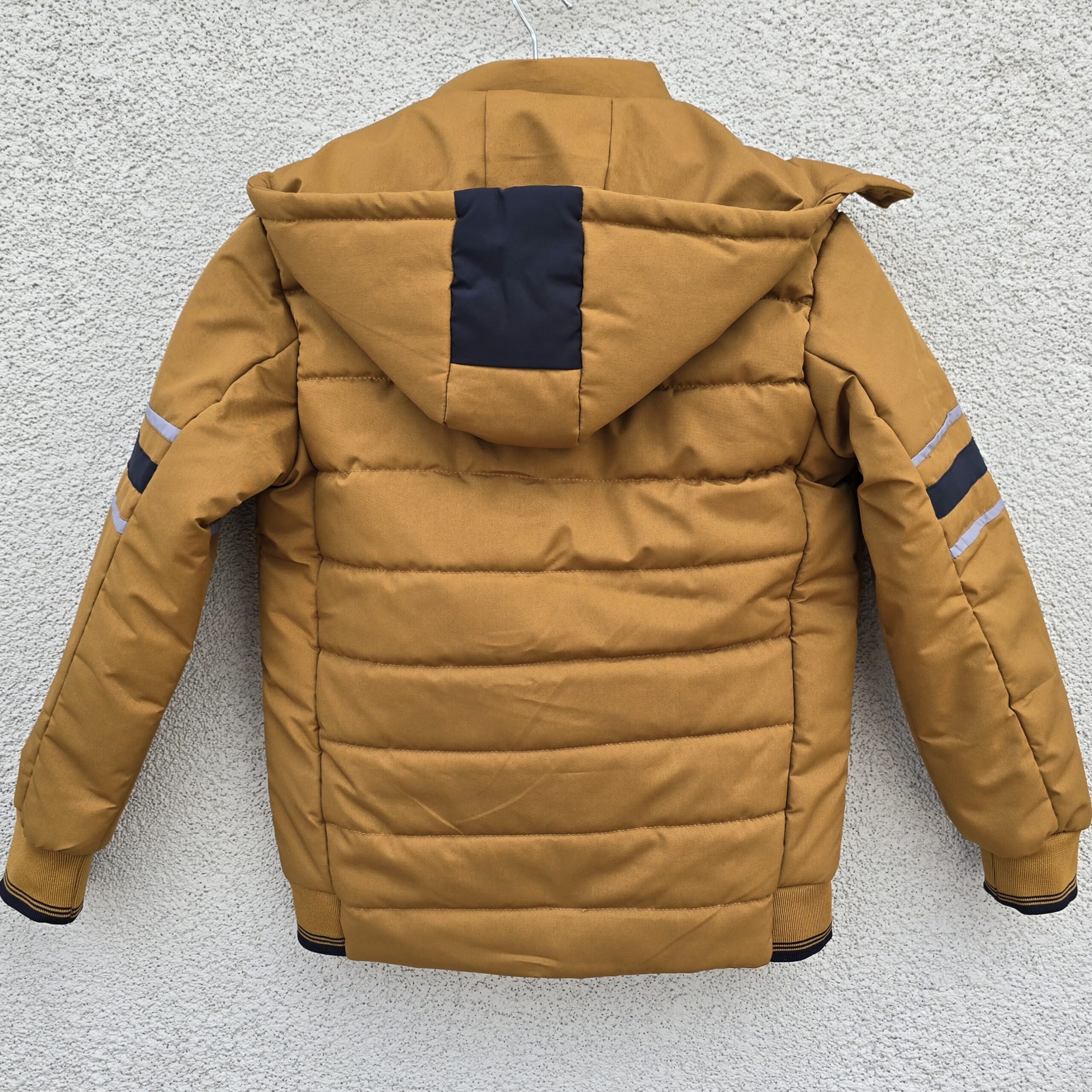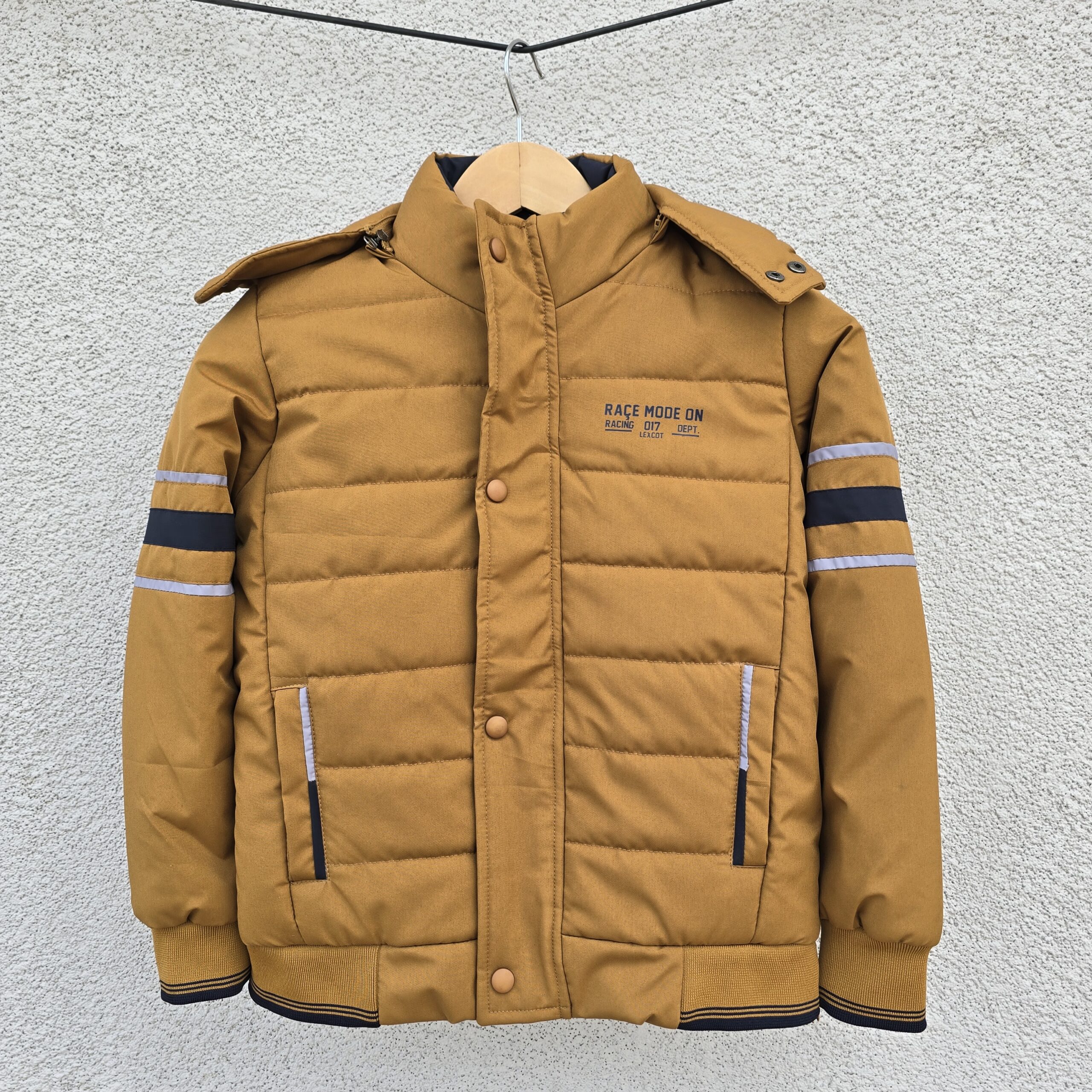 Winter-ready boys’ puffer jacket in solid mustard colour with bold black and grey accents. Features a detachable hood, zip and snap button closure, ribbed cuffs and hem, and two pockets for functionality and warmth.