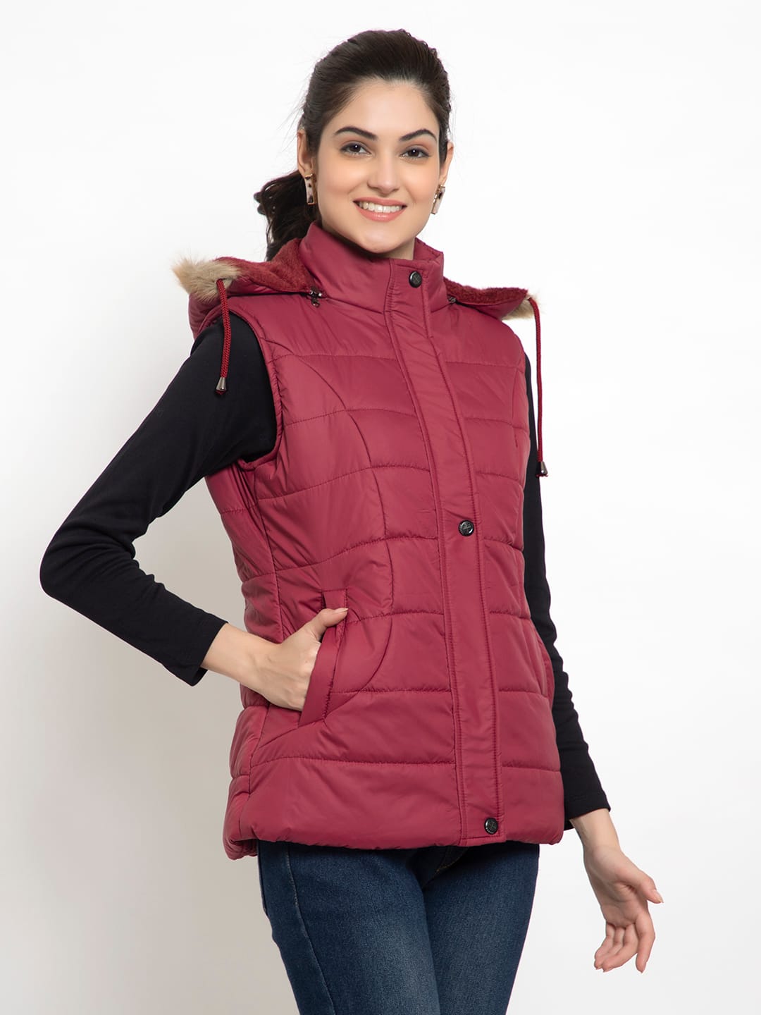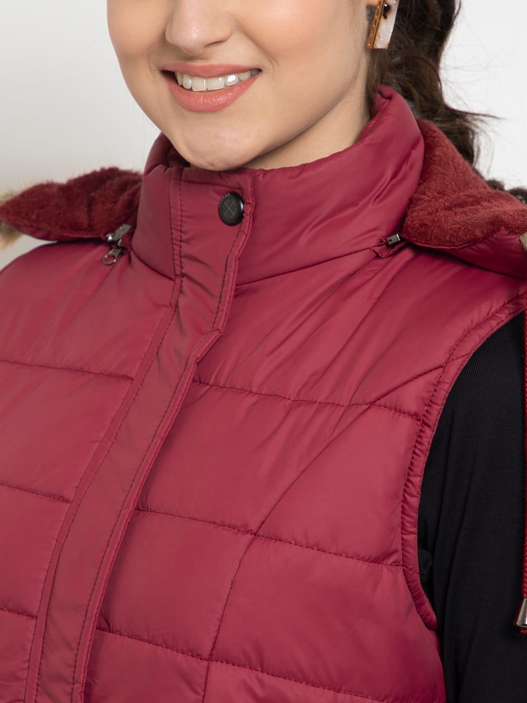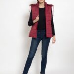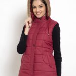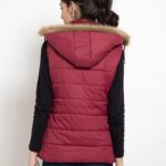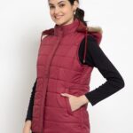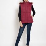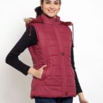 Upgrade your winter wardrobe with the Lexcot Women’s Premium Hooded Sleeveless Jacket in a luxurious Mahroon color.