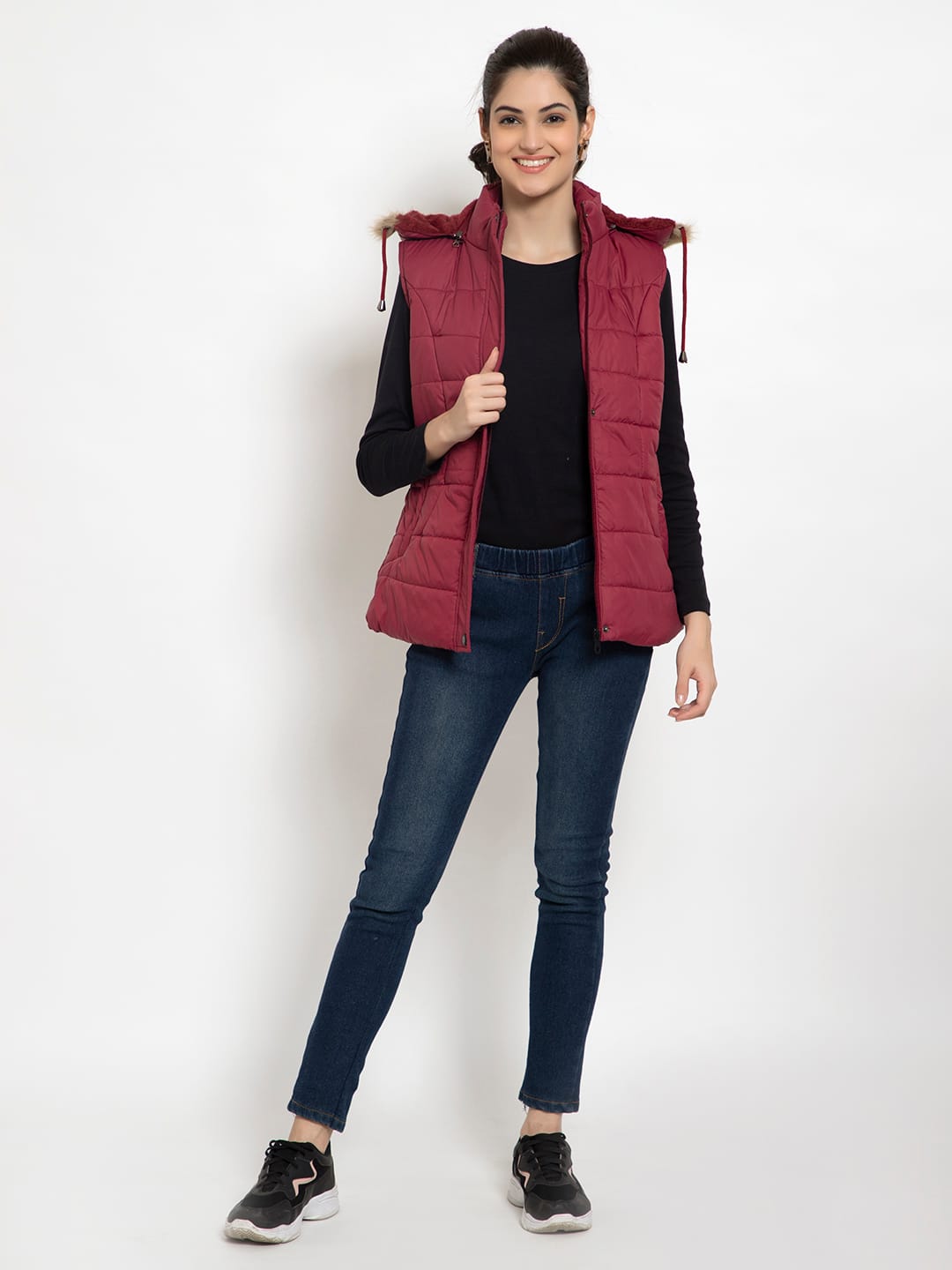 Stay stylish and warm with Lexcot’s Mahroon hooded sleeveless jacket for women. Ultra-lightweight, soft, and designed for casual outings and winter travel. Features a comfy hood, durable zipper, and sleek finish — your perfect winter layering essential!