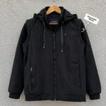This men’s hooded jacket in jet black is a multifunctional winter essential featuring detachable sleeves that convert it easily into a sleeveless vest. Designed for adaptable wear, it includes a full front zipper, secure zip pockets, ribbed cuffs and hem, and an adjustable drawstring hood. Whether layered for warmth or worn light, this jacket delivers style and practicality for everyday winter use.