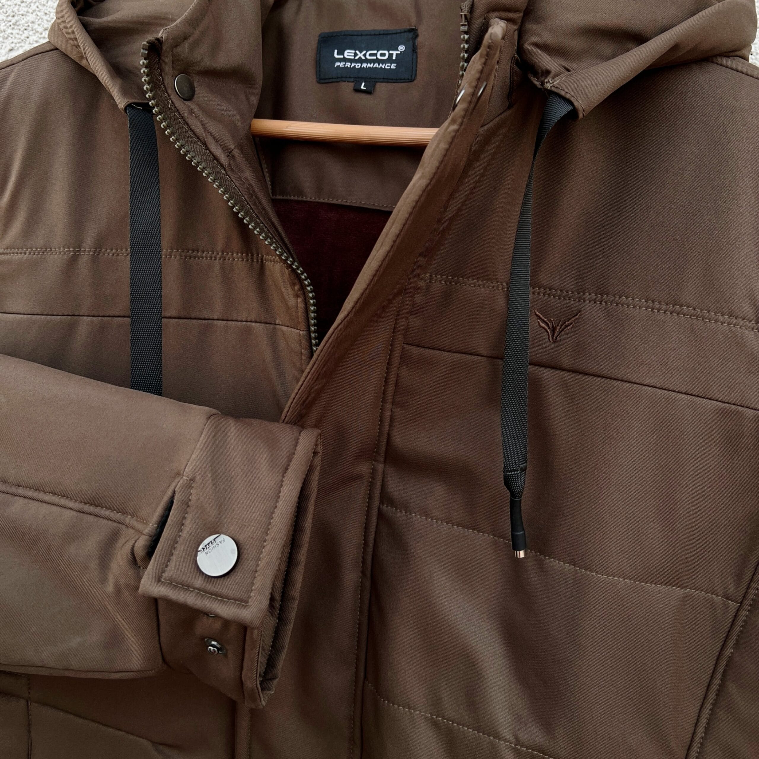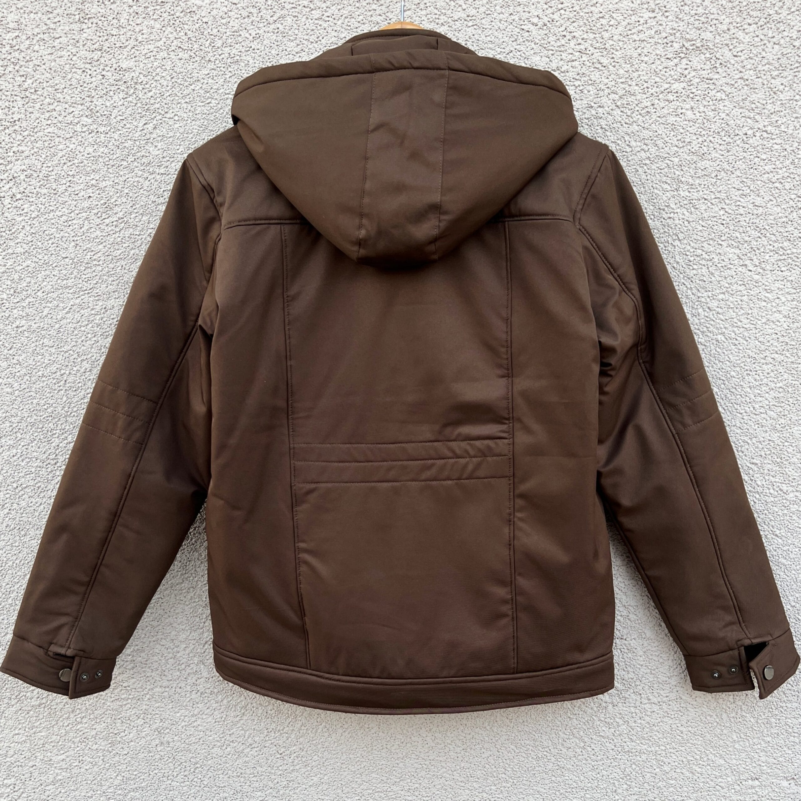 A sleek and functional coffee winter jacket with a hood, ideal for cold weather. Designed for comfort, warmth, and everyday wear.