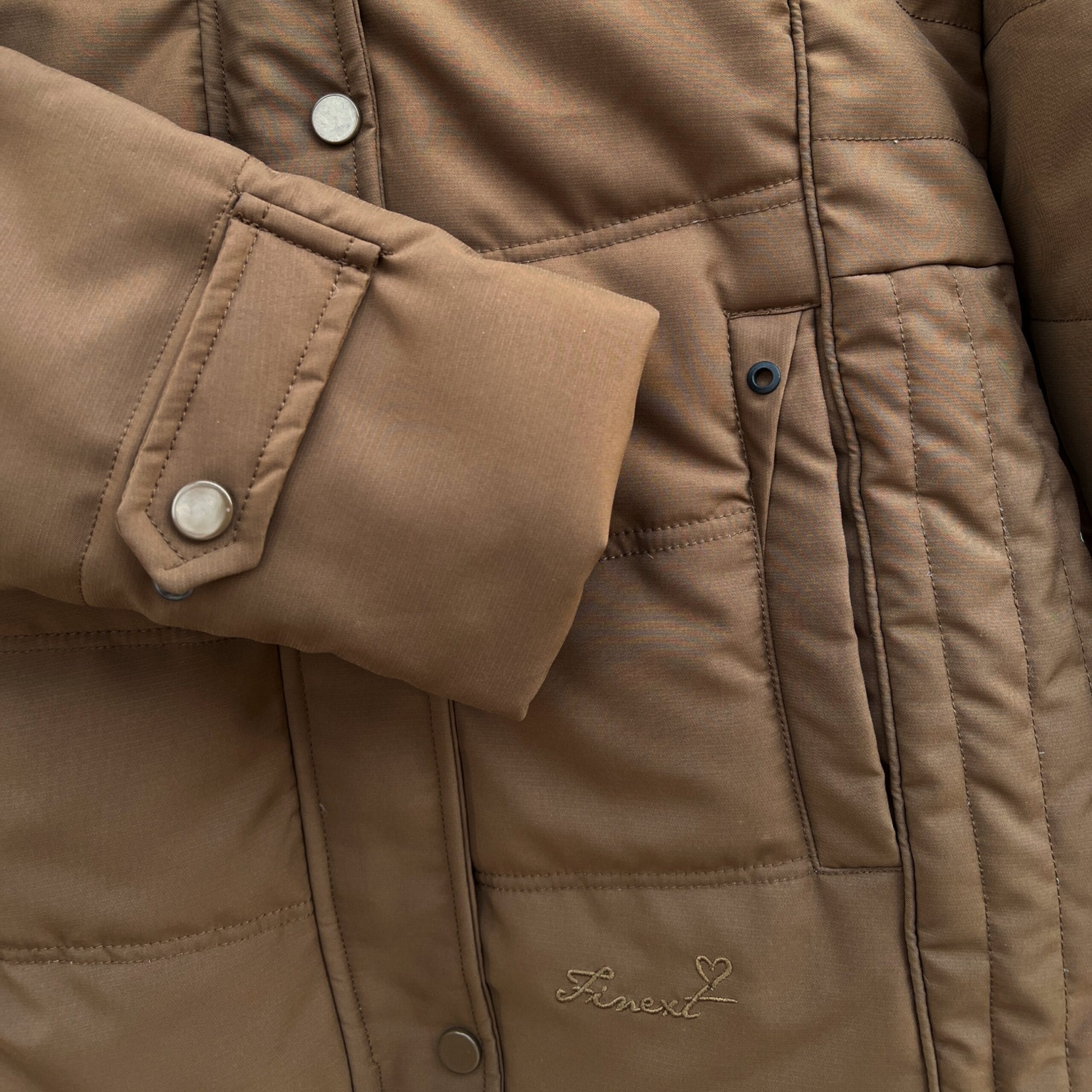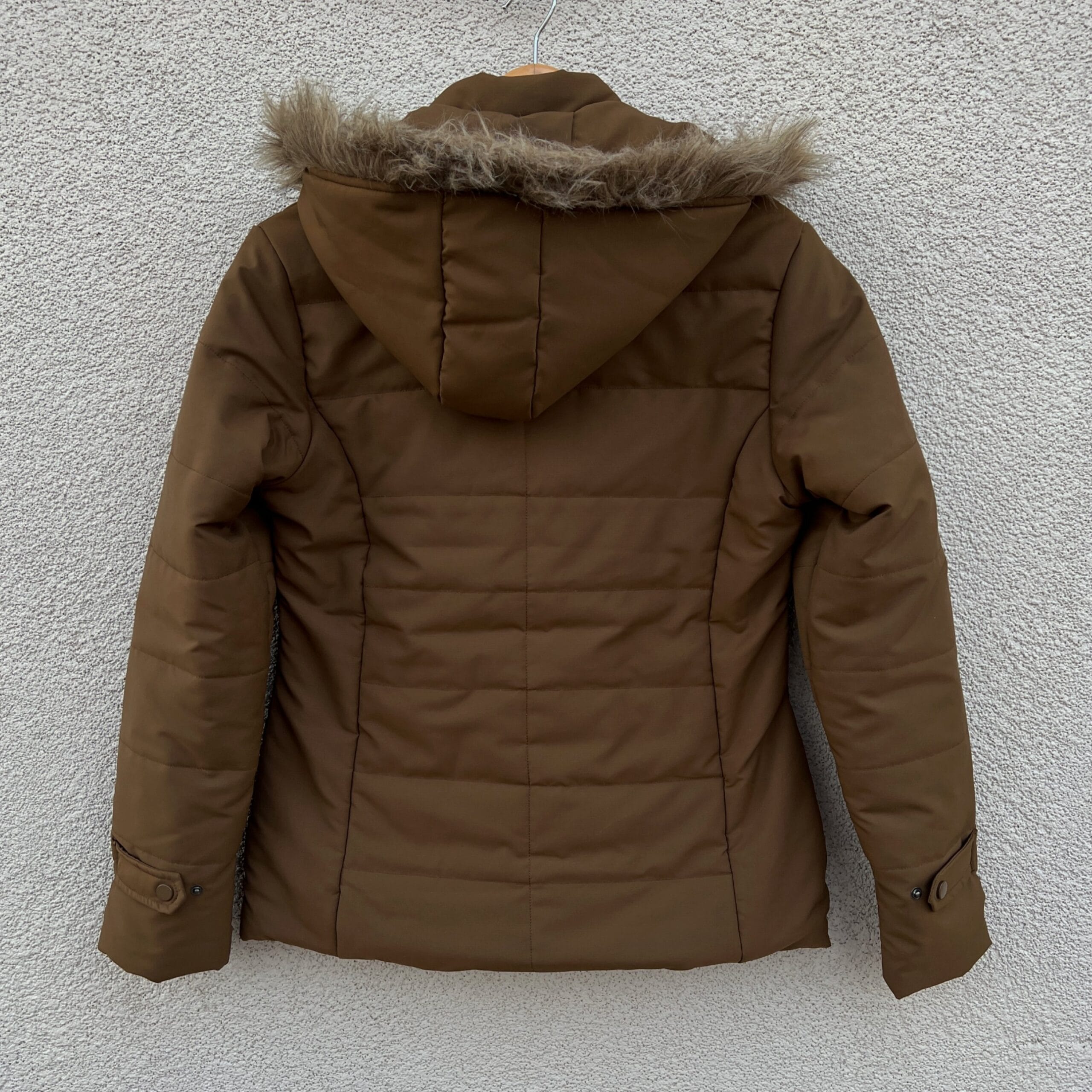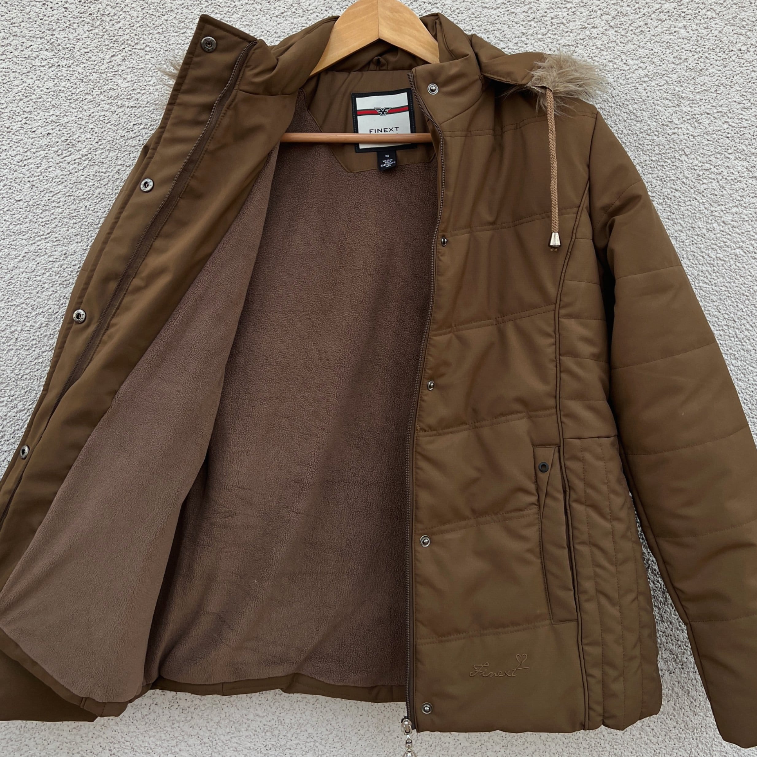 This brown women’s puffer jacket combines warmth with contemporary style. Crafted for comfort, it features a padded design with horizontal quilting, a high neckline, and front snap-button closure for added protection. The jacket is equipped with functional side pockets, an adjustable drawstring hood trimmed with soft faux fur, and sleek stitching along the waist for a flattering fit. Perfect for daily wear during winter outings, it offers both fashion and insulation.