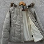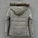 Stay stylish and warm with this elegant light beige colour puffer jacket for women. Designed with a high neck, snap buttons, and adjustable hood with faux fur trim, it’s a perfect winter essential for chilly days.