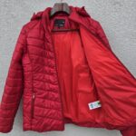 Elegant and warm red color puffer jacket for women, featuring a detachable hood, two pockets, and crafted from premium 20-D fabric with 180 GSM micro fibre filling. Available in sizes M to XXL.