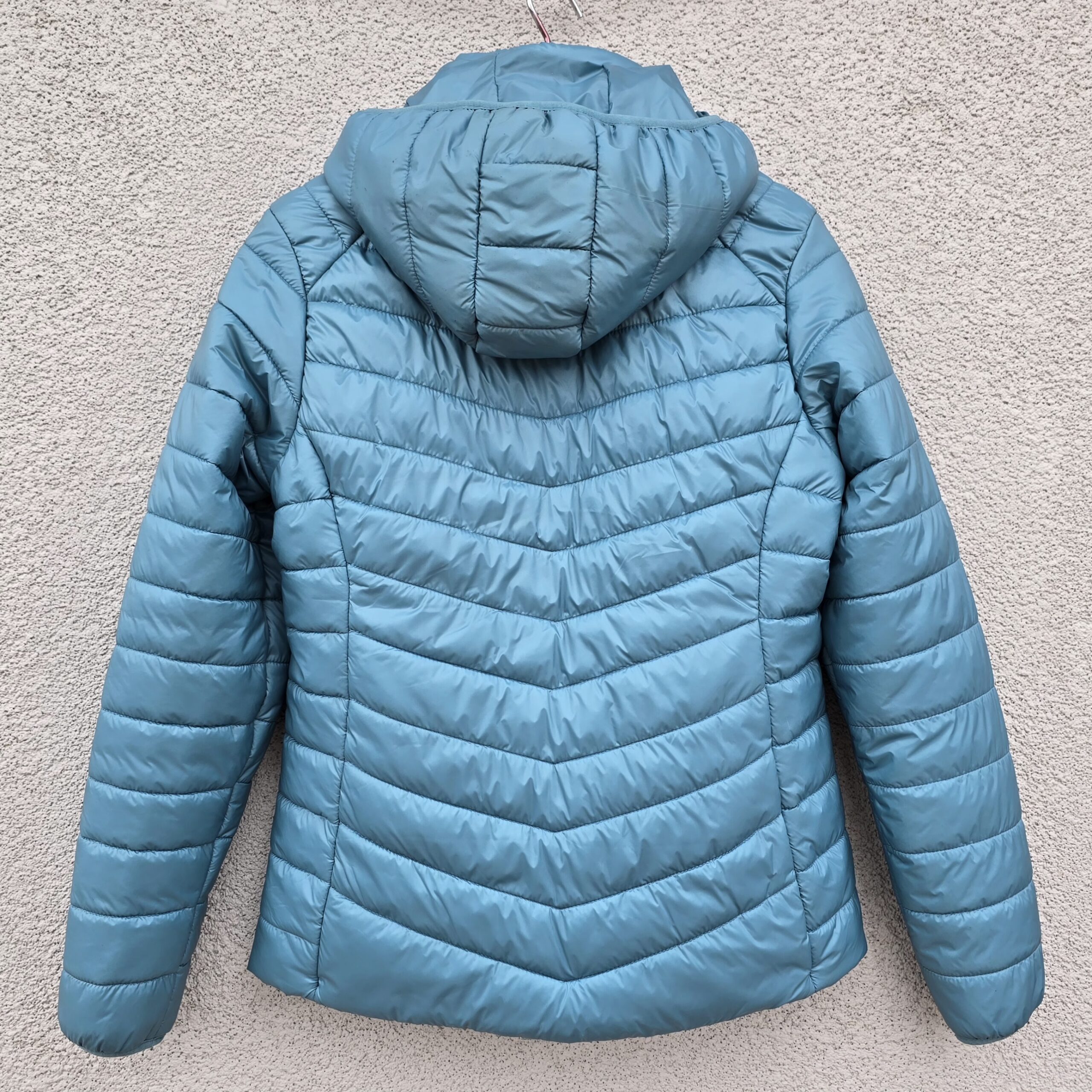 Elegant and warm sky blue color puffer jacket for women, featuring a detachable hood, two pockets, and crafted from premium 20-D fabric with 180 GSM micro fibre filling. Available in sizes M to XXL.